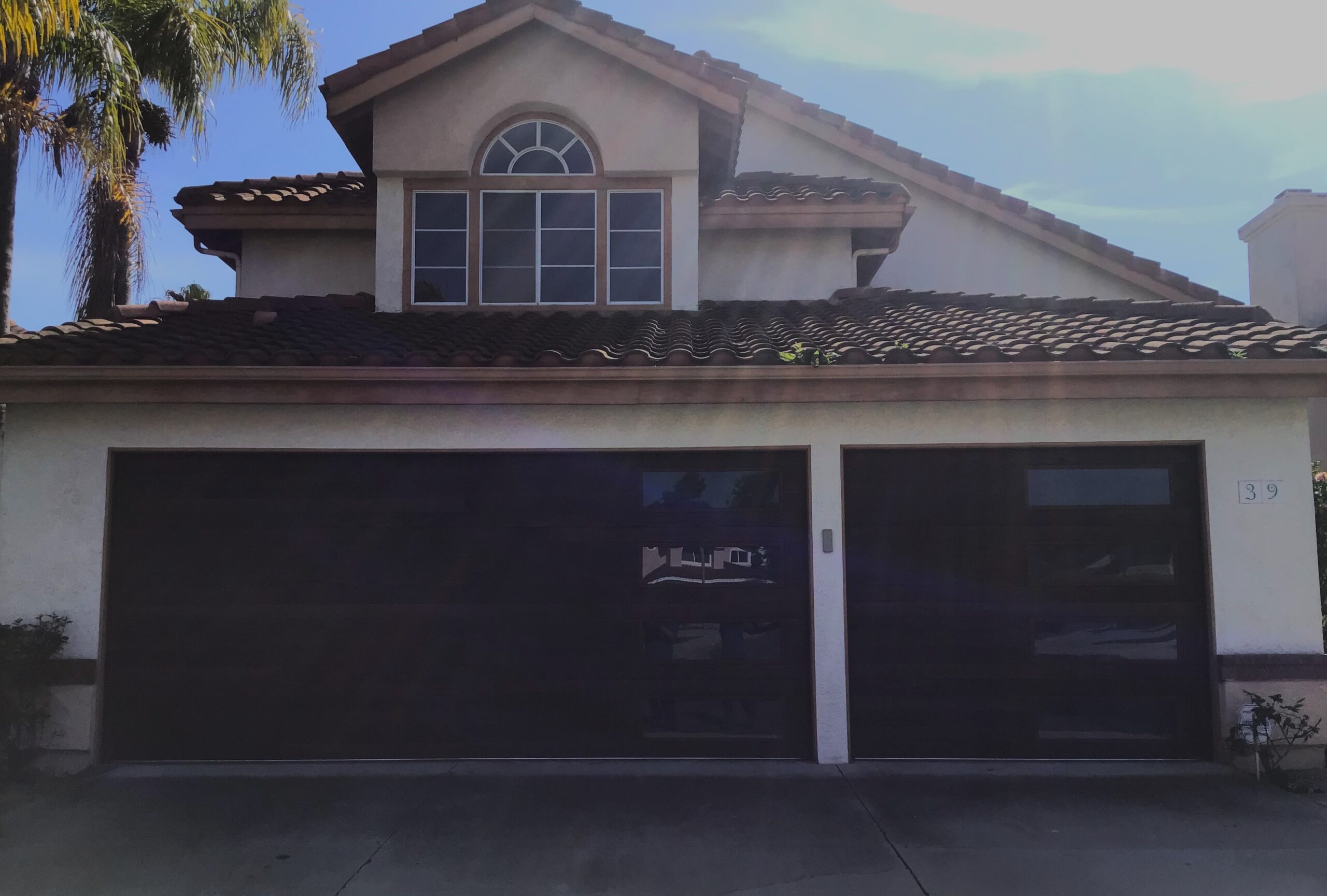 dark oak faux wood garage door with vertical windows in Dana Point after retrofit installation