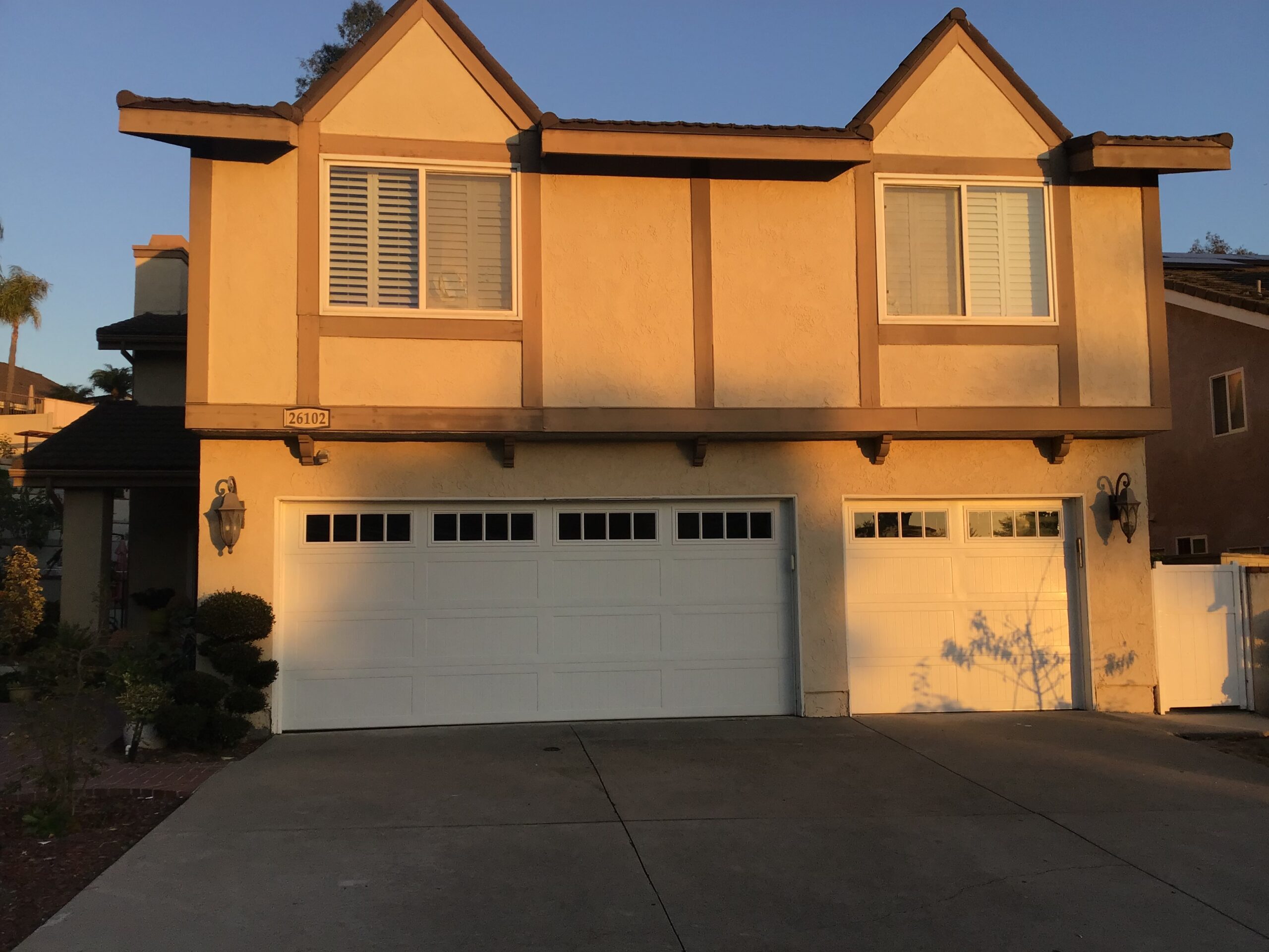 White long panel traditional steel garage door with windows in San Clemente new retrofit